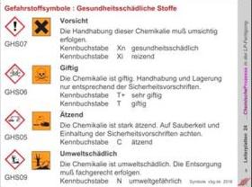 Gefahrstoffsymbole in alter und neuer (seit 06/2015) Symbolik nach dem GHS-Schema. Gesundheitsschädliche und brandgefährdende sowie feuergefährliche Stoffe. Allgemein notwendige Schutzmaßnahmen beim Umgang mit Chemikalien.