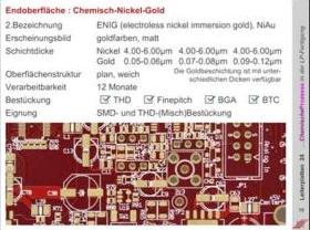 Schichtdicken von Endoberflächen aus Zinn, Nickel, Gold, OSP, Silber und Palladium. Übliche Schichtaufbauten für ENIG, ASIG und ENEPIG. Informationen zu zulässigen Lagerzeiten bis zur Verarbeitung in der Baugruppenproduktion.
