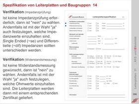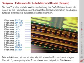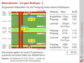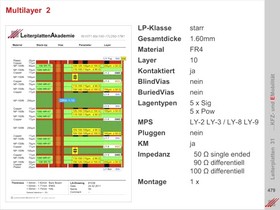 Exemplarische Dokumentation von einfachen ein- und doppelseitigen Leiterplatten bis hin zu komplexen Multilayern. Grafische Beschreibung des Aufbaus von Multilayersystemen. Dokumentation elementarer physikalischer Eigenschaften.