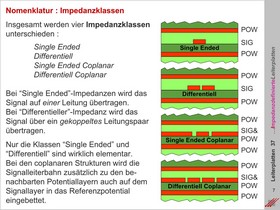 Nomenklatur für die Beschreibung von Impedanzen auf unterschiedlichen geometrischen Moduln. Single Ended, differentielle und coplanare Geometrien. Impedanzen vom Typ Microstrip und Stripline. Erläuterungen zur Kombination von Signal- und Powerplanes.