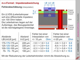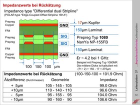Berechnung von Impedanz-Abweichungen in Referenzmoduln. Lötstoplack und Bestückungsdruck als beeinflussende Faktoren. Unregelmäßige Impedanzen in Abhängigkeit von der Ätzmechanik. Querschnittsprofile, Flankenwinkel und Funktionsflächen.