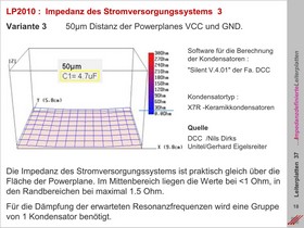 Niederimpedante Konstruktion von Stromversorgungssystemen. Der Einfluß der Abstände zwischen den Powerplanes auf die Funktion des Multilayer-Systems. Gerechnete Kondensatorgruppen zur Dämpfung von Resonanzfrequenzen.