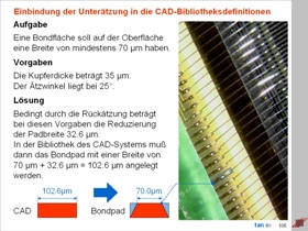 Wer wird in diesem Seminar angesprochen?Die Entwicklung der elektronischen Baugruppen ist in stetem Wandel. Das ist nichts Neues. Inzwischen ist die HDI-Technologie der Stand der Dinge. Jetzt steht allerdings ein weitreichender Umbruch bevor. Mit der weiteren Reduzierung der Gehäuse-Abmaße und der Abstände der Löt- und Anschlußflächen zueinander ist eine Grenze überschritten worden. HDI (High-Density) wird jetzt von der MFT (Micro Fineline Technology) abgelöst. Leiterbildstrukturen < 85µm werden in den nächsten Jahren der Standard. Es ist völlig ausgeschlossen, diesen Übergang zur MFT mit den alten Designregeln zu bewältigen. Die zunehmenden Probleme mit Funktionsausfällen bei Leiterplatten und Baugruppen signalisieren, daß die Produzierbarkeit eines MFT-Layouts nicht mehr so zuverlässig vorhersagbar ist, wie man das bisher (angeblich) von HDI-Layouts kannte. Die Analyse der Fehler zeigt deutlich, daß Lücken in der zuverlässigen theoretischen Vorhersage produzierbarer Qualitäten bestehen. Die alten Designregeln sind inzwischen zu unspezifisch. Es müssen neue Regeln geschaffen werden, mit denen die Komplexität der realen Produktionsbedingungen in den unterschiedlichsten Geltungsbereichen abgebildet werden kann. Diese Regeln müssen nachvollziehbar formuliert sein, und sie müssen sich in der Praxis in ihrer Wahrheit beweisen. Das ist nur mit einem korrekten mathematischen Modell umsetzbar. Dieses Modell muß die Qualität eines Expertensystems haben, auf dem die zukünftige Entwicklung elektronischer Baugruppen sicher aufsetzen kann. Schaltungsdesigner, CAD-Designer/innen, CAM-Bearbeiter/innen, Leiterplattenhersteller und auch Baugruppenproduzenten sind in dem Ablauf für die Entwicklung einer elektronischen Baugruppe die Entscheidungsträger. Für sie ist dieses Seminar ideal. "tan α" vermittelt die Zusammenhänge und fördert das partnerschaftliche Miteinander auf der Linie "CAD - CAM - Leiterplatte - Baugruppe". Die übersichtliche Darstellung der Themen ist ebenso interessant für alle, deren Aufgabe es ist, das Produkt "Baugruppe" führend oder beratend zu begleiten. Ihr Referent