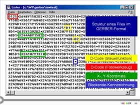 Grundstruktur von GERBER-Files. Standard- und Extended-Gerber-Format (RS274X). Syntax für die Angabe der Koordinaten und Vektoren. D-Codes für Steuerfunktionen und für Fotowerkzeuge. Interpolation und Auflösung von Layout-daten. m.n.-Formate.