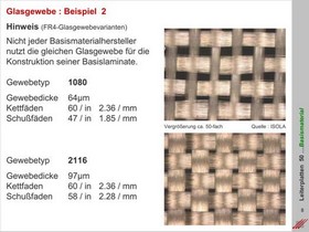 Verfügbare Dicken und Gewebedichten für Glasgewebe. Anzahl der Kett- und Schußfäden pro Flächenreferenz. Glasgewebequalitäten für unterschiedliche Anwendungen von elektronischen Baugruppen.