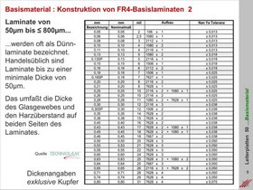 starrem Basismaterial für die Herstellung von Leiterplatten. Verfügbare Prepreg Kombinationen. Übliche Dickentoleranzen. Übersicht zu den Varianten im Aufbau von Laminaten für Innenlagen.