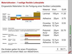 Allgemeine Kostenkalkulation des Materialeinsatzes für die Produktion flexibler, starrer und starrflexibler Leiterplatten. Zuordnung der Kosten zu diskreten Multilayeraufbauten.