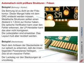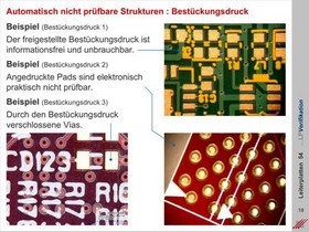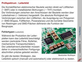 "Leiterplatten 54 …LPVerifikation" erläutert die Komplexität und die Aussgagekraft der Tests, die auf einer Leiterplatte zum Einsatz kommen. Üblicherweise sind niemals alle Eigenschaften einer Leiterplatte mit automatischen Systemen prüfbar. In der Praxis gibt es also keine Prüfung, die für sich alle Qualitäten erfassen kann. Es ist stets ein Prüfszenario erforderlich, das die individuellen Eigenschaften einer Leiterplatte möglichst vollständig erfaßt.