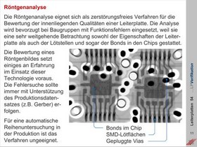 Röntgeninspektion von Multilayern in dreidimensionaler Qualität. Bewertung von Lötflächen, Bonds in Chips und der Kupferdicke von THT-Bohrungen. Vermessen der Paßgenauigkeit der einzelnen Lagen eines Multilayers.