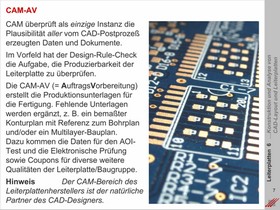 Anforderungen an die CAM-Bearbeitung von Daten aus dem CAD-Postprozeß. Design-Rule-Check und Prüfung auf Vollständigkeit der Dokumentation. Ergänzung fehlender Informationen und Daten für die fachgerechte Produktion von Leiterplatten.