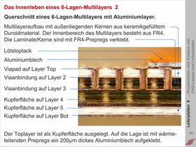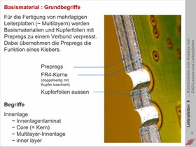 Kupferfolien, Prepregs und Basislaminate. Erläuterung der Grundbegriffe. Erklärung der Funktion der elementaren Materialkomponenten für den Bau einfacher Leiterplatten bis hin zu komplexen starrflexiblen Multilayern.