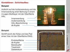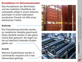 Kontaktierungsverfahren für das Einbringen von Kupfer in die Hülse von Bohrungen. Anforderungen an die Schichtdicke des Kupfers, die sich aus der Anwendung, der Funktion und der Bauteilmontage ergibt. Metallisieren von Leiterplattenkonturen und Höhenniveaus.