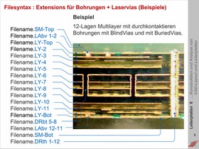 Dokumentation von Produktionsdaten. Vergabe von Extensions im Umfeld einer definierten Filesyntax. Fileextensions für grafische (i.e. Leiterbild, Siebdruck) und mechanische (i.e. Bohren, Laser, Ritzen, Fräsen) Bearbeitungsschritte zur Produktion einer Leiterplatte.