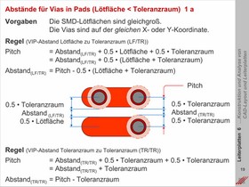 Kalkulation der Geometrien für ein spezielles Routing im CAD-Layout. Berechnung von Abständen, Vias und Lötflächen für die Routingstrategie mit VIPs (i.e. Vias In Pads). Erläuternde Beispielrechnungen und Übungsaufgaben für das Selbststudium.