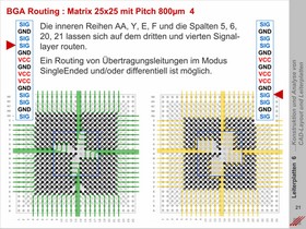 Exemplarische Berechnung und Routing-Vorgabe für das Fan-Out eines BGAs mit einer Matrix von 25x25 Spalten und Reihen. Beispielhafte Verteilung der Signalplanes und der Powerplanes unter Berücksichtigung der Signal- und Powerintegrität.