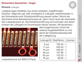 Lotpastenapplikation und Lotpastenvarianten. Lotpasteninspektion. Flußmittel, Auftragsverfahren und Lotpastenschablonen. Druckparameter. Berechnungsmodelle für das Auslösen von Lotpaste. Geometrien im Padstack der CAD-Bibliothek.
