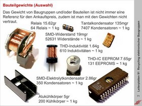 Übersicht zur Varianz der Bauteile mit Blick auf Bauform, Mechanik, metallische und chemische Kombination. Einschätzung des Wertes elektromechanischer Bauteile auf Basis ihres Gewichtes.